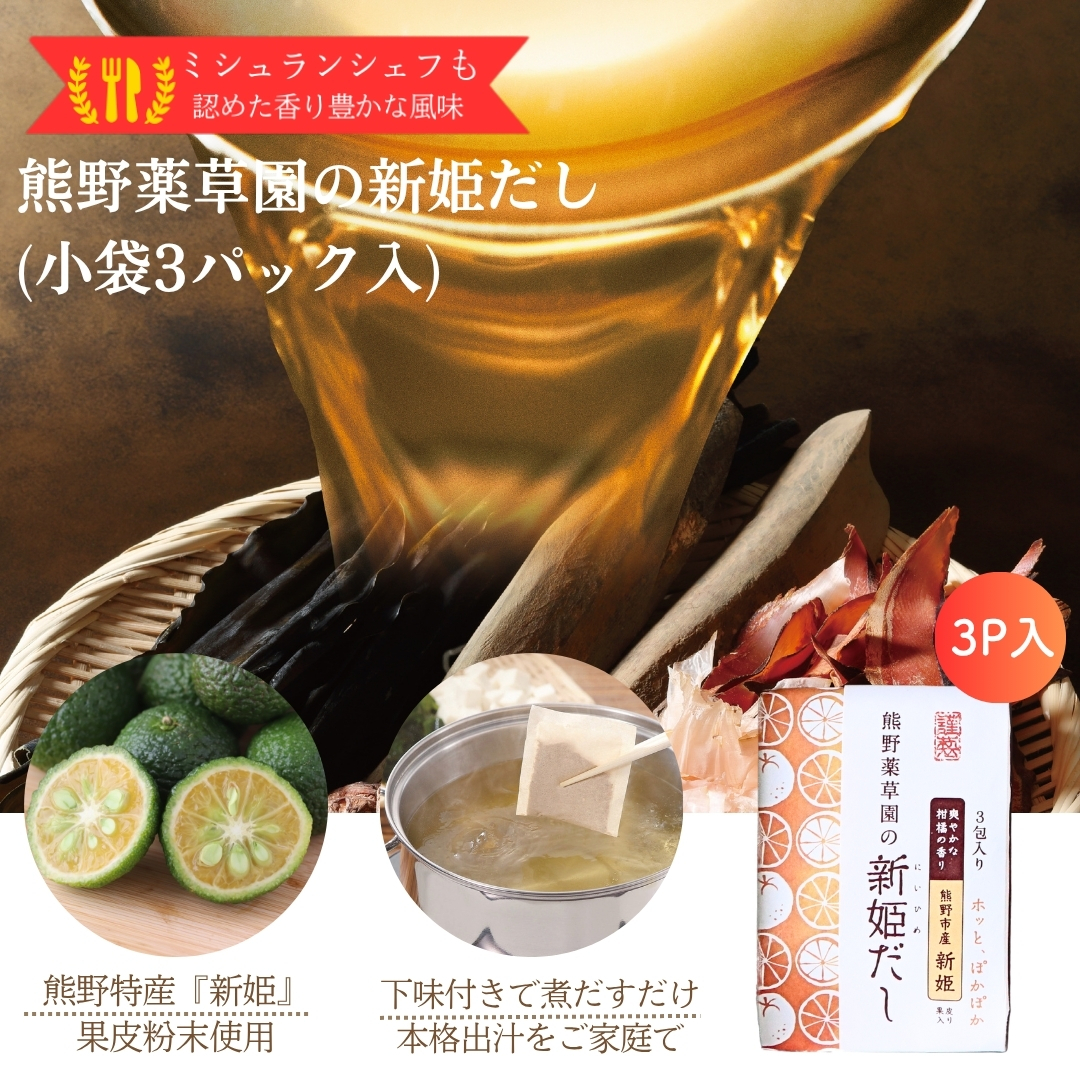三重県熊野市でのみ栽培される柑橘『新姫』の爽やかな香りと酸味を生かし、きりっとした味わいのだしパックです。