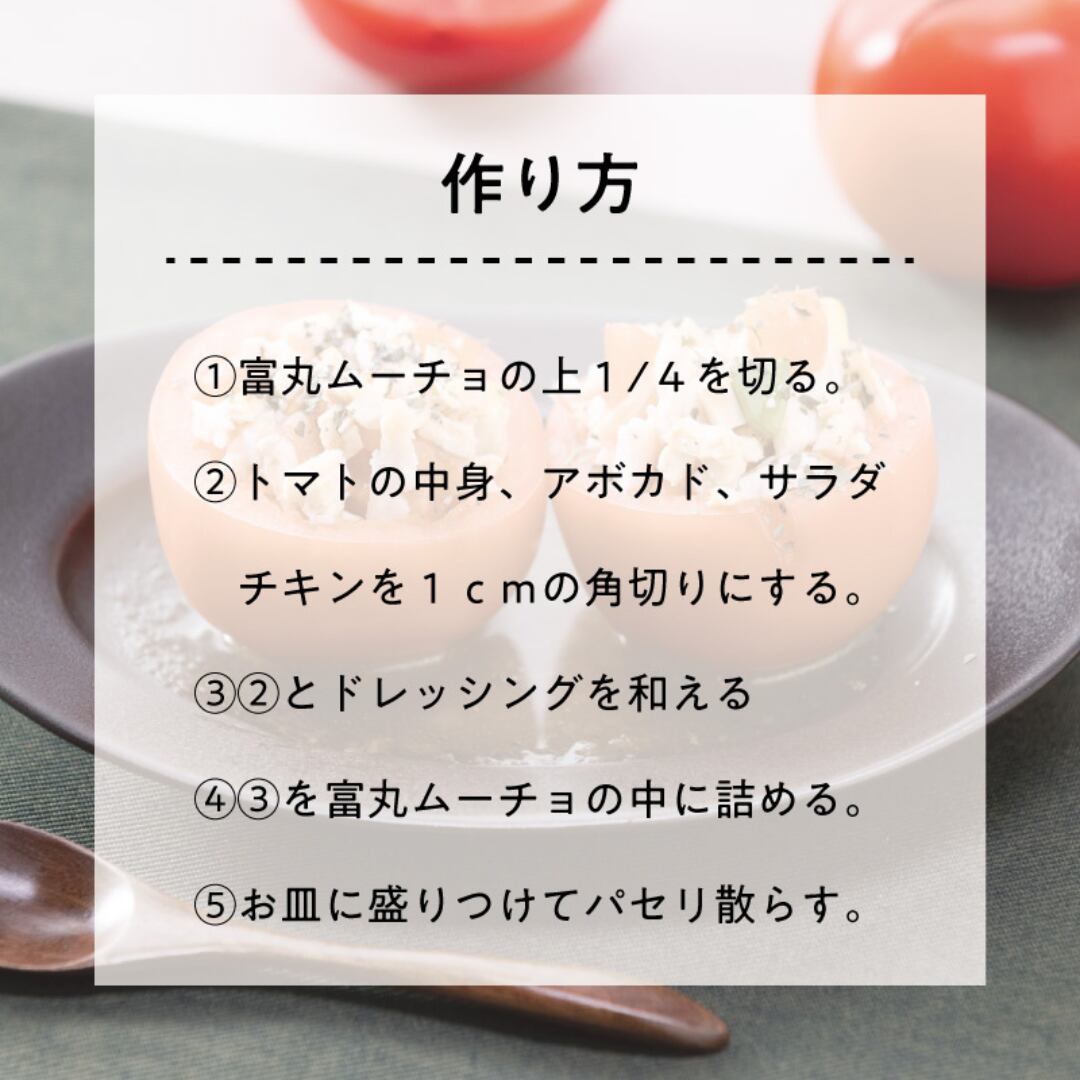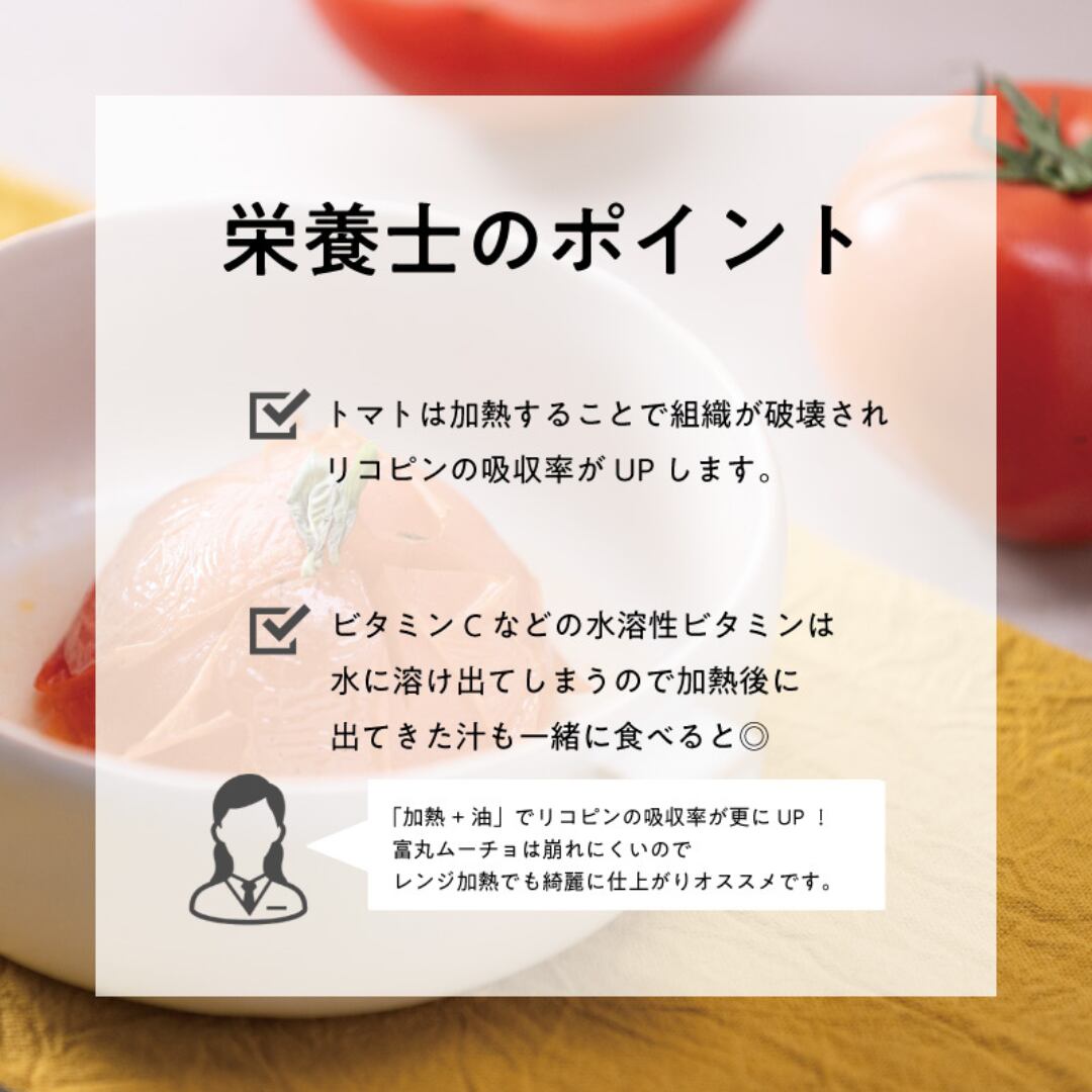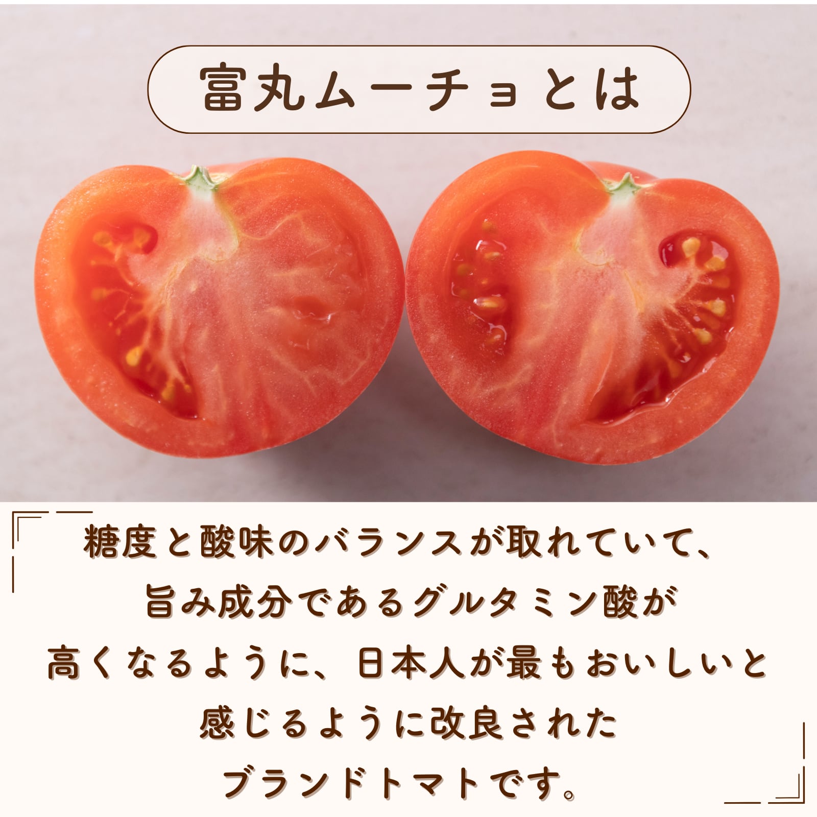 富丸ムーチョは一般的なトマトに比べゼリー部分が少なく、しっかりとした果肉、甘みと酸味のバランスが取れた味が特徴の品種です。